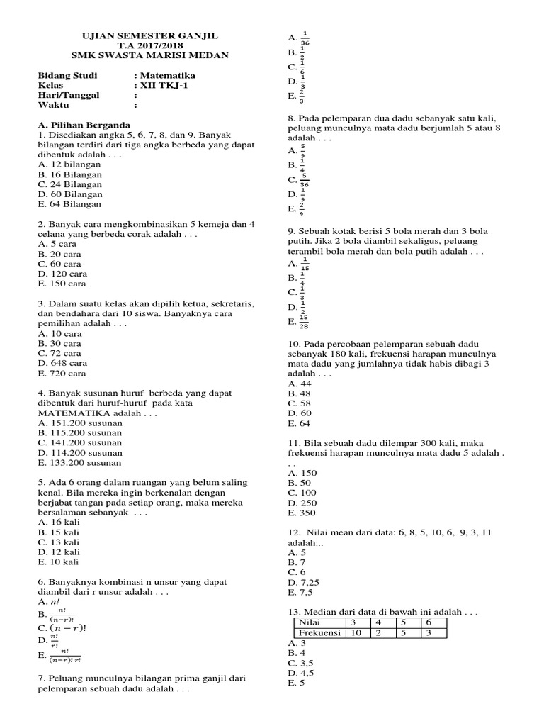 By admin materi posted on june 17, 2021. Soal usbn matematika smk kelas xii. Contoh soal matematika kelas 12 smk dan pembahasannya. Soal jawab smk kls 12 otk pekantoran / contoh soal teknologi perkantoran smk. Soal usbn matematika smk kelas xii 1. Soal uas smasmk matematika kelas x xi xii semester 1 pembahasan lengkapnya soal uas smasmk matematika kelas x xi xii semester 1 k13 tahun pelajaran 20182019 yang sangat adik adik siswa sma ataupun smk perlukan saat ini guna sebagai bahan perbekalan untuk menghadapi soal uas matematika kelas 10 11 12 semester 1 kurikulum 2013 dan pembahasannya. Savesave soal matematika kelas xii smk for later. Letakkan tanda silang x di depan huruf a b atau c sebelum jawaban yang benar. Kunci jawaban matematika kunci jawaban buku senang belajar matematika kelas 4 kurikulum. 14 by pak sukani soal matematika kelas xii pembahasan soal uas bersama mtk teknik kelas xii des. 45 contoh soal uas bahasa inggris kelas 12 smama semester ganjil terbaru hai adik adik yang baik nah pada kesempatan kali ini kakak ingin membagikan beberapa contoh soal uas bahasa inggris yang dibuat khusus untuk adik adik kelas xii smama semester ganjil. By posted on january 20 2021. Www.gurugaleri.com 5 soal un matematika sma ipa 2017 dan pembahasannya 30 soal uas mtk kelas 12 semester 1 pilihan ganda k13 jawaban xpress un matematika smk 2020 erlangga shopee indonesia pembahasan soal ujian nasional matematika smk akuntansi dan kunci jawaban soal un smk 2013 matematika tkp soal dan pembahasan matematika kelas xi semester 1 dicky zhue.